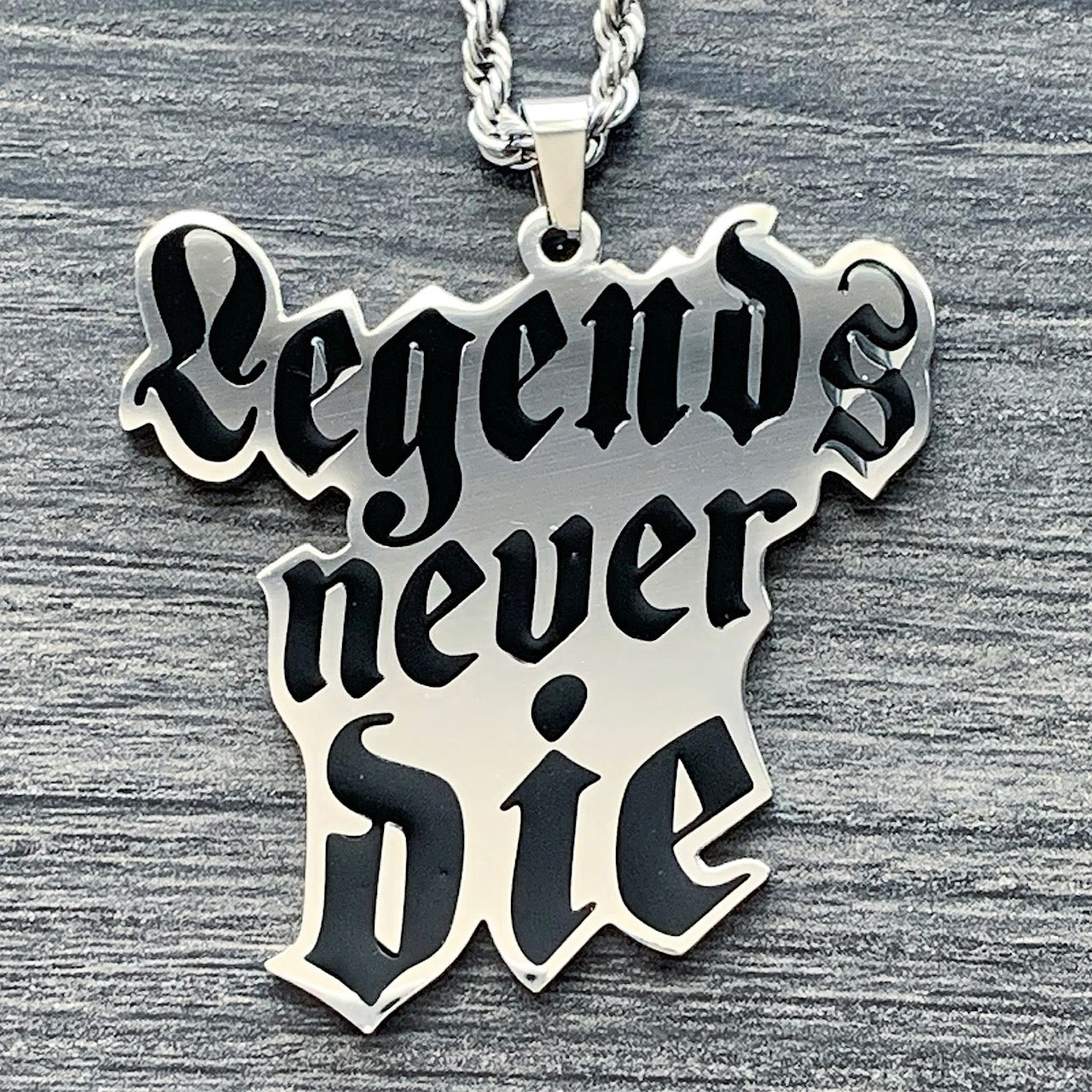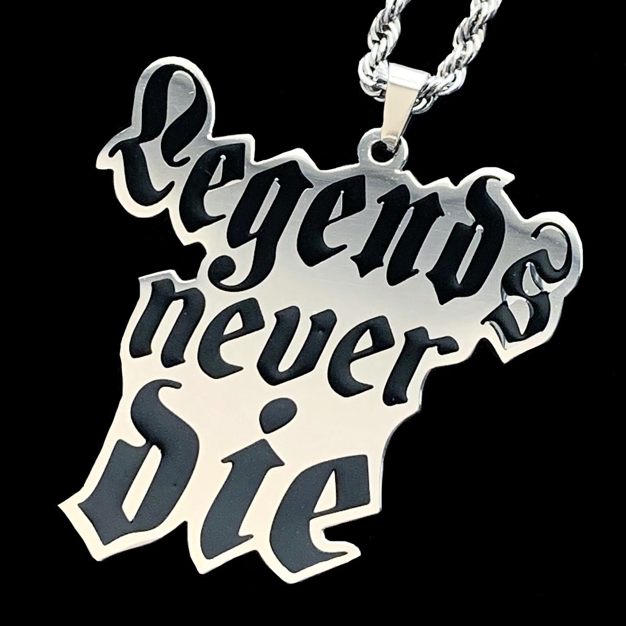 Legends Never Die pendant is laser carved out of solid 316L surgical stainless steel and filled with hard enamel to produce a smooth durable coating. It is polished to a mirror quality achieving a shiny reflective surface. The necklace is not prone to surface scratches and is rust & corrosion resistant! GUARANTEED.