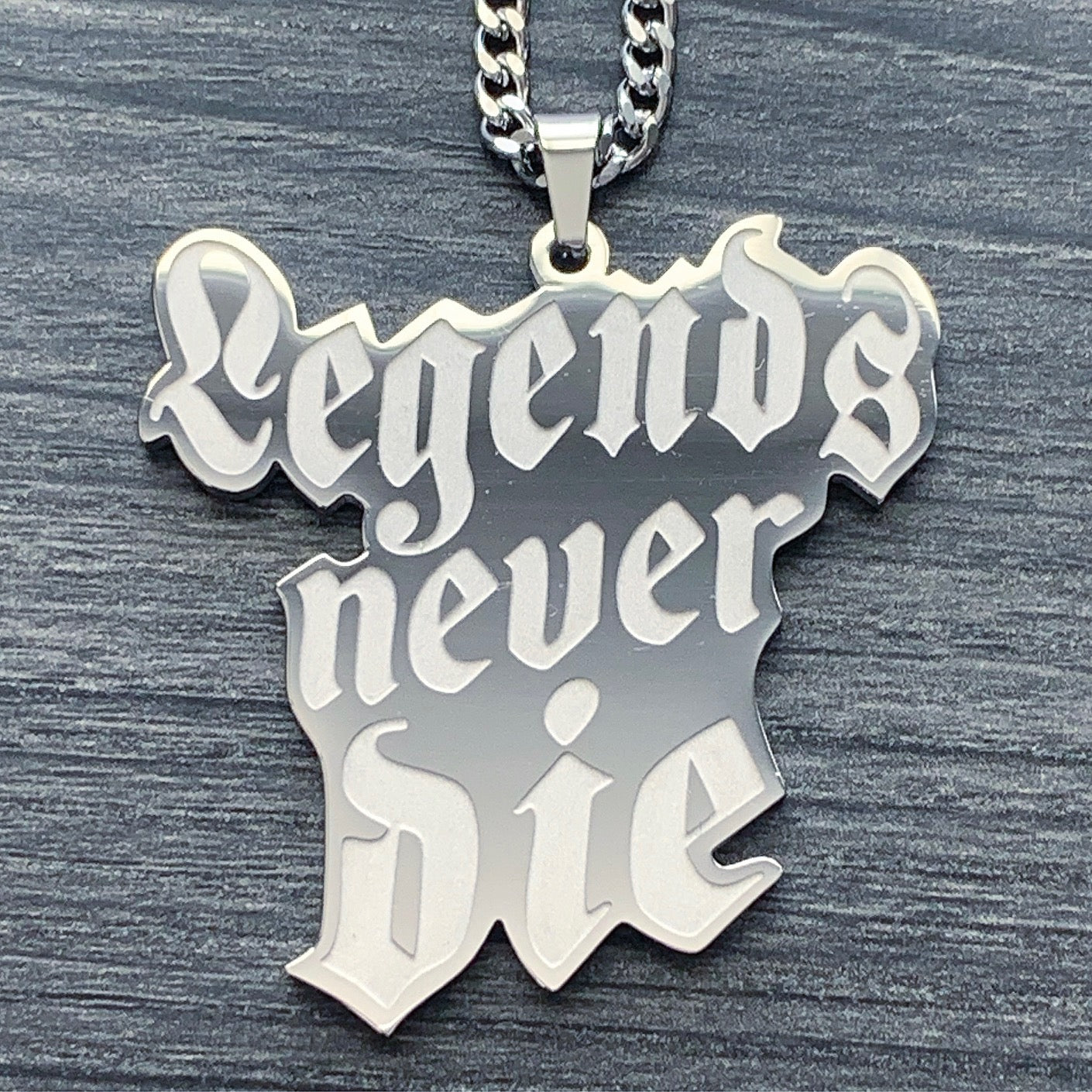 Legends Never Die pendant is laser cut from solid hypoallergenic stainless steel engraved with a satin finish and smoothed by a polished outline. It is also buffed to a mirror quality achieving a shiny reflective surface. The necklace is not prone to surface scratches and is rust & corrosion resistant! GUARANTEED.
