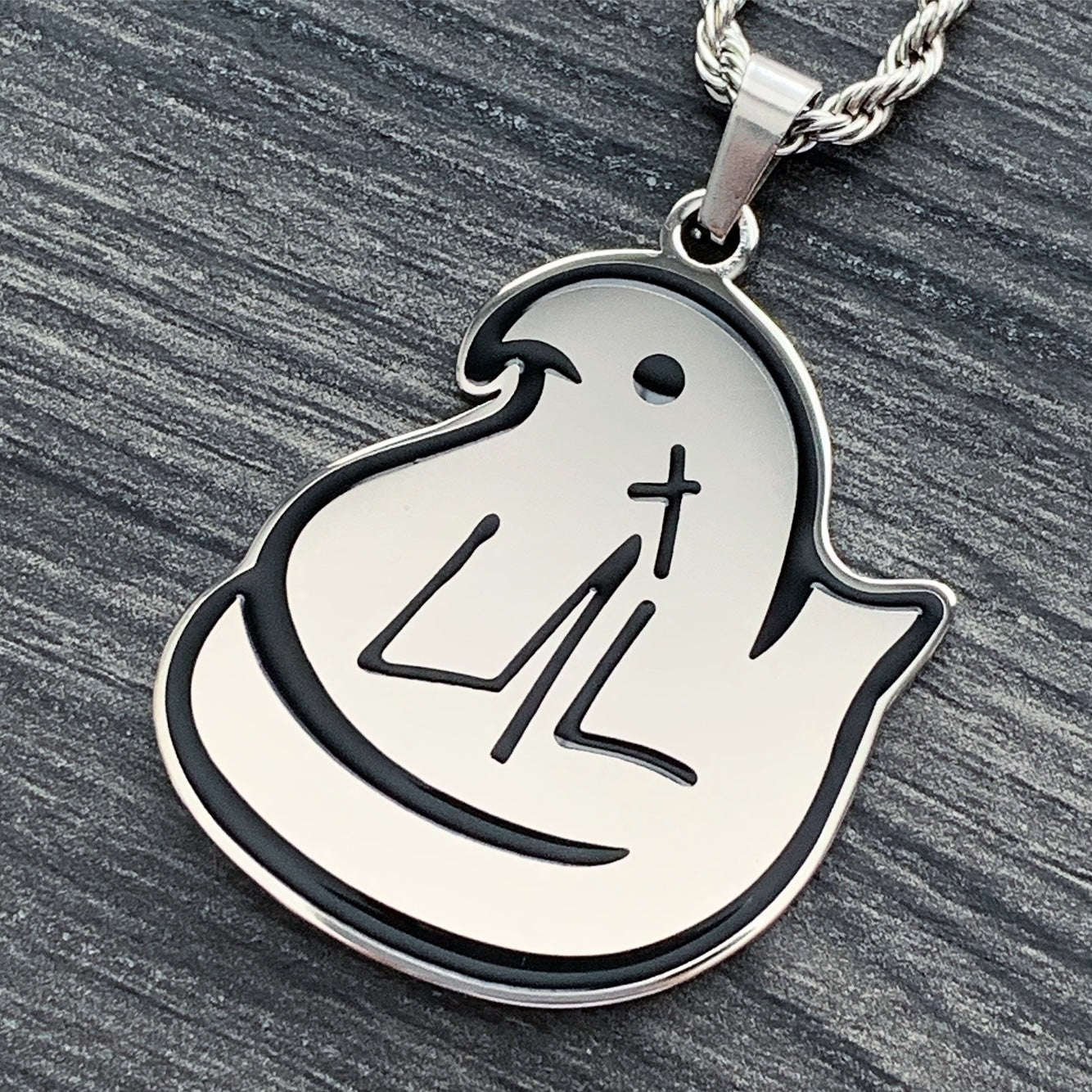 Peeps pendant is laser carved out of solid 316L surgical stainless steel and filled with hard enamel to produce a smooth durable coating. It is polished to a mirror quality achieving a shiny reflective surface. The necklace maintains a scratch free appearance and will never fade or tarnish! GUARANTEED.